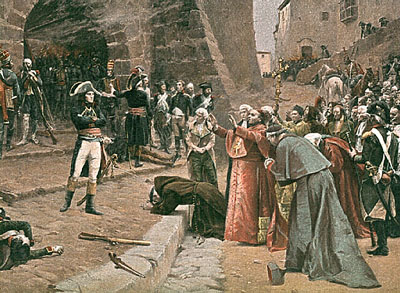Во всех этих случаях действовала вполне планомерная политика Наполеона, которой он держался всегда: ни одной бесцельной жестокости и совсем беспощадный массовый террор, если это ему было нужно для подчинения завоеванной страны. Он уничтожил в завоеванной Италии всякие следы феодальных прав, где они были, он лишил церковь и монастыри права на некоторые поборы, он успел за те полтора года (с весны 1796 до поздней осени 1797 г.), которые он провел в Италии, ввести кое-какие законоположения, которые должны были приблизить социально-юридический строй жизни северной Италии к тому, который успела выработать буржуазия во Франции. Зато он тщательно и аккуратно эксплуатировал все итальянские земли, где только побывал, много миллионов золотом он отправил Директории в Париж, а вслед за этим и сотни лучших творений искусства из итальянских музеев и картинных галерей. Не забыл он и лично себя и своих генералов: они вернулись из похода богатыми людьми. Однако, подвергая Италию такой беспощадной эксплуатации, он понимал, что как ни трусливы (по его мнению) итальянцы, но что очень любить французов (армию которых они же и содержали из своих средств) им не за что и что даже их долготерпению может наступить внезапный конец. Значит, угроза военным террором - главное, что может на них действовать в желательном для завоевателя духе.