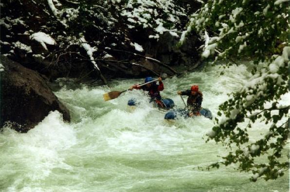 Повреждения: Две согнутые поперечины у ката Кирилла и Сереги, сломанная кница левого баллона третьей поперечины и погнутая в этом месте продолина у "Хавроньи". При разборе полетов были сделаны выводы, что в стабильном состоянии (нахождение Гули с катом в улове у левого берега под "Прощай Родина") не следует хватать первую попавшуюся морковку (которая может оказаться и без карабина) а ждать стопроцентного шанса. С параллельной группой возникли некоторые трения по поводу, что мы всей группой сняли страховку у "Прощай Родина" и ушли в догонку за перевернувшимся катом, создав тем самым трудности в прохождении порога их группе, четверка которой также ушла за Гулей. В наше оправдание можно привести доводы о том, что положение параллельной группы было конечно тяжелым, но не критическим, в отличии от нас, учитывая, что Гулю унесло в каньон и никакой информации о ней мы не располагали. Причем, учитывая далеко не нулевую вероятность оверкиля, в "Сосновом" нам могли понадобится все наши суда. 5 мая. Подъем в 7:00. Вышли в 10:19. До начала каньона "Малый Блып", заканчивающимся порогом "Щель" около 10-12 минут ЧХВ. Ориентир начала каньона - река делает правый, а затем крутой левый поворот, перед правым поворотом - входом в каньон у левого берега обломок скалы пиромидальной формы и завал плавника. Дорога подходит к реке и хорошо видна с воды. Через 150 м. крутой правый поворот с прижимом к скальному выступу и косой бочкой у левого берега. Проходили по внутренней стороне поворота, заходя у правого берега. Далее следует технический участок с маневрами между камней. На выходе из Каньона русло сужается и реку перегораживает бочка. Слева проносной язык, справа пенный котел. Кирилл с Серегой опять залегли. Кирилл зацепился за кат и его вынесло из бочки, Сергей остался полоскаться. Единственное, что мы успели это уйти чуть влево и упали в бочку гадая, не раздавили ли Сергея. Когда мы прошли бочку и я оглянулся назад у меня внутри все похолодело - Сергея в бочке не было. Правда спустя секунду я увидел его плывущего чуть правее нас. После выхода из "Щели" участок спокойной воды. Волков благополучно добрался вплавь (кролем) до берега, выпустив при этом весло, которое было поймано нашим катом. После поимки Серегиного весла мы и подоспевший Макс занялись спасением катамарана с Кириллом.Однако затолкать кат и плавающего рядом человека в улово не удалось. Кирилл был взят на борт (скорее на раму) двойки, а перевернутый кат был передан подоспевшей четверке. Кирилл был высажен на берег, а двойка и каяк ушли вдогонку за четверкой и перевернутым катом. Но, как оказалось, они и сами люди взрослые и, когда мы подошли, двойка уже была загнанна в улово (11:50). У девичьей двойки при прохождении каньона порвался упор и им пришлось зачалиться в середине каньона. Их ждали около часа (починить упор им помогали Макс с Лехой). в 12:50 отплыли дальше. До автомобильного моста (ориентир начала "Соленых скал" 10 минут ЧХВ. По дороге есть места для стоянок. Чалка за