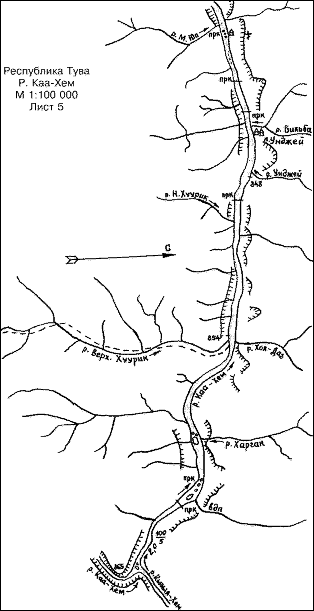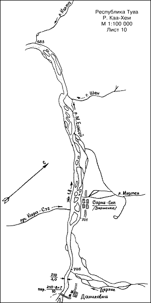 Сплав по р. Кызыл-Хем в избранном варианте маршрута начинается от пос.Уш-Бельдыр (Северный Аржаан), который связан с Кызылом авиационным сообщением. Аэропорт расположен на левом берегу р. Белин 1-2 км выше ее устья. Однако поскольку основная часть груза (включая лодки) была доставлена вертолетом и выгружена значительно ближе к поселку, сплав был начат в одной из проток в дельте р. Шишхид-Гол.