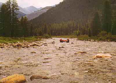 Река по ущелью вначале течет немного вправо, а затем резко, под 90 градусов поворачивает налево. В месте поворота впадает Шара-гол (справа). Общая длина ущелья примерно 3 - 4 км. Далее долина опять расширяется, и река мелеет, распадается на протоки. К вечеру доходим до притока Ара-Хонголдой. В его устье лежит большое ледяное поле толщиной около метра. Погода во второй половине дня испортилась - моросит дождь. Встаем на поляне возле этого притока. Справа и слева - протоки Китоя, стоим на острове.