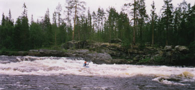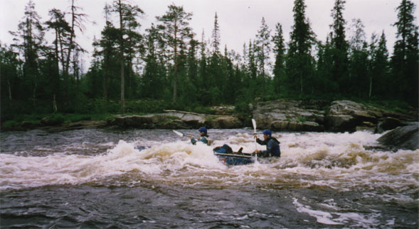 После порога река разливается, становится мелкой. Основная струя резко уходит влево. При удачном прохождение котла туда и выносит. Таймень успешно положило, вынесло на камни и поломало. За порогом в 100 метрах на левом берегу начинается дорога, которая через 3 км выходит на "ковдорский тракт". По "тракту" еще около километра до дамбы. И еще полтора до поселка. В связи с поломкой Тайменя и необходимостью встретить в поселке экипаж Нерпы, было решено закончить поход. Прохождением водопада и оставшихся порогов пришлось пожертвовать.