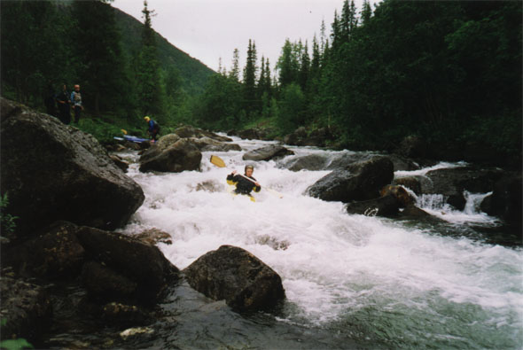 Струя становится глубже, течение еще быстрее. В остальных местах камни окрасились в цвет наших полиэтиленов, а каякеры часто совершали толкательные движения. Им не хватало каких-то 10-15 см воды! Таймень и КНБ проводили (работа для настоящих мужчин 8-), а каньонные места обносили по берегу.