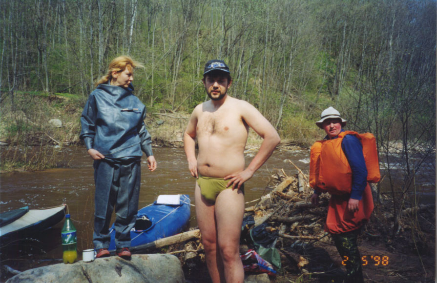 Теперь, прервавшись, по примеру классиков, на самом захватывающем месте, сделаю одно лирическое отступление. Мой капитанский опыт до этого был невелик - четыре похода, из них три с девушками, да еще и с разными. Первый киль случился в 1995 г. на Щегринке. Моим матросом была абсолютная чайница - она не то что байдарку, палатку впервые в жизни увидела. Обстановка такая - резкий правый поворот, левый высокий берег представляет собой выход родничка через глинистую почву... Есть только два вида подножного покрытия хуже глины - болото имени Лизы Бричкиной и зыбучие пески. При попытке сделать шаг эта глина (цвета и консистенции свежей выгребной ямы) поглощает ногу до колена. Попытка вытащить эту ногу требует опоры на другую, которую постигает та же участь. Так вот, на Щегринке внизу глинистого конуса завал, а из завала через струю строго на уровне груди проходит бревно, струя идет прямо под него, а из-за поворота ничего не видно. Иными словами, картинка, достойная включения в учебник водного туризма и снабжения подрисуночной подписью - "Классическое место для киляния". Не кильнуться можно только: зная о засаде заранее, спешившись и обнеся по правому берегу, который, кстати, представлял собой кладбище разбитых кораблей. Ну так вот, когда я увидел, что спасения нет, я успел сказать одну фразу: "Оля, сейчас будет очень плохо". Почему я не употребил более короткое (всего шесть букв) слово, которое намного точнее описывало ситуацию? Следующее мое ощущение - я в воде по грудь, одной рукой цепляясь за дно лодки, другой удерживая весло, Оля болтается на том самом бревне, также не упустив весла (!). Всех промежуточных событий - заноса под дерево, поворота лагом, закусывания борта, момента переворота - нет. Словно какой-то заботливый цензор аккуратно поработал ножницами.