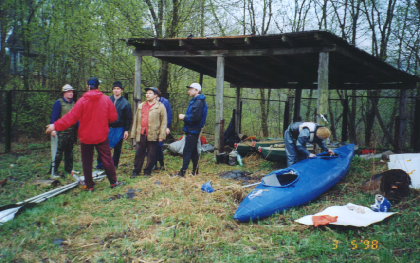 Так вот, Вася не пошел и о билетах заранее побеспокоиться было некому, так что ехать 30 апреля нам пришлось до Бологого, где и кантоваться почти всю ночь. Знающие люди, правда, утверждают, что не "всю ночь", а лишь несколько часов. Ну кому как. Надо отдать должное всем членам экипажа, что терпели довольно долго. Но замученные московской жизнью и еще не до конца поверившие в то, что поход начался, мы бродили по грязному вокзалу, не зная, чем заняться. Самые отважные улеглись спать прямо на байдарках, а остальные маялись. Наконец, в 12 часов с минутами Димка Яковлев заявил, что первое мая уже наступило и можно выпить с чистым сердцем. Что мы тут же и сделали. Показалось мало и совесть заела - разбудили Куликова и выпили с ним. Потом попытались привлечь Адмирала, но он гордо отказался. Вот так и развлекались до электрички. Где-то около 6 утра сели в поезд (это действительно скорее поезд, чем электричка, поскольку внутри оборудован по принципу так всем хорошо знакомых сидячих поездов "Москва-Питер"). И почти сразу же уснули.