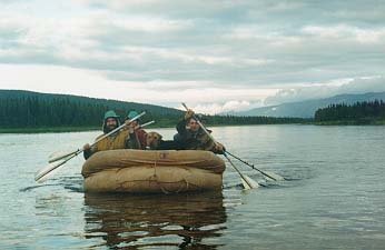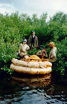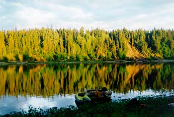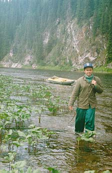 Сам Подчерем - речка очень красивая, и вобщем то для подьема вверх неплохая - по берегам почти всюду каменистые отмели - что-то типа тропы-бечевника (о подьеме на веслах забудьте сразу - и бечевой то в одни руки не всегда байдарку можно вытянуть), однако: по берегам многометровой полосой растут некие местные кувшинки ("лопухи") - течения в них естественно никакого - никаким корабликом на пятнадцать метров байдарку от берега не отведешь, веревка цепляется за лопухи, байдарка зарывается в лопухи, затем тыкается носом в берег - приходится, ныряя чуть не по уши, выводить ее на чистую воду - и так каждые двести метров. На подьем до верховьев Подчерема нужно отводить десять дней минимум (плюс обязательно одна дневка - задалбывает подобное время препровождение ужасно). От типа судов скорость подьма практически не зависит - у нас были ПСН и "Егерь", а паралельно шла группа каких-то уральских ребят на Салютах - шли примерно в одном темпе - то мы их обгоняли, то они нас.