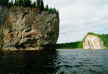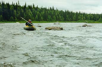 Когда мы подходили к камню, оно было левее нас, а когда "Егерь" уже был слева от камня, ПСН вдруг оказался правее и "Егеря" и камня. Байдарку на его месте просто размазало бы по камню, а ПСНу хоть бы что (за весь поход ни одна надувная часть его не была пробита). Сполз правее камня и пош?л дальше. Правда, спящие в н?м получили утреннюю информацию о температуре и степени свежести воды и насладились предчувствием кораблекрушения и команды "Полундра". Встали на завтрак в 7.00 не доходя Средних ворот. Вскоре морось исчезла и вышло солнце.