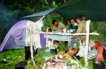 Встали в 16.25 немного дальше ручья. Там большая площадка с высокой травой. Лагерь разбили примерно в 120 м. от берега в березняке. Оборудованное место'. стол, скамейки. Но с дровами сложно. А с гнусом хорошо, благо место не продувается. Последний раз встретились с байдарочниками- они с завистью смотрели на то, что мы уходим с этой реки. Вечером пересчитали продукты и устроили большую обжираловку.