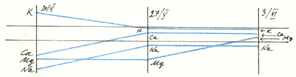 от другой. Эти линии ограничивают предел физиологических колебаний исследуемых элементов. Например, для калия он заключен между 19 и 24 мг %, поэтому 19 мг% соответствует нижней горизонтали, а 24 мг% - верхней. Физиологические изменения концентраций лежат в пределах 24-19 = 5мг%, следовательно, изменение количества калия на 1 мг% соответствует 4 мм нашего графика.