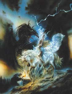 Интригующие и завораживающие, гобелены чуть ли не сходят со стен. Вот сцены охоты, пасторальные сцены и сцены из мифологии Амбера. На одном из гобеленов Дворкин и Единорог пишут Книгу Единорога. На другом в недрах Колвира создается Лабиринт Амбера. Вот изображен Оберон, закованный в цепи в темнице Хаоса. Два самых больших гобелена расположены у самой лестницы. На первом изображены Корвин и Блейз на лестнице снаружи замка вызывающе стоит Эрик. Второй гобелен изображает Корвина, создающего Лабиринт, искры обрамляют его непреклонное лицо, а тело отмечено истощением.